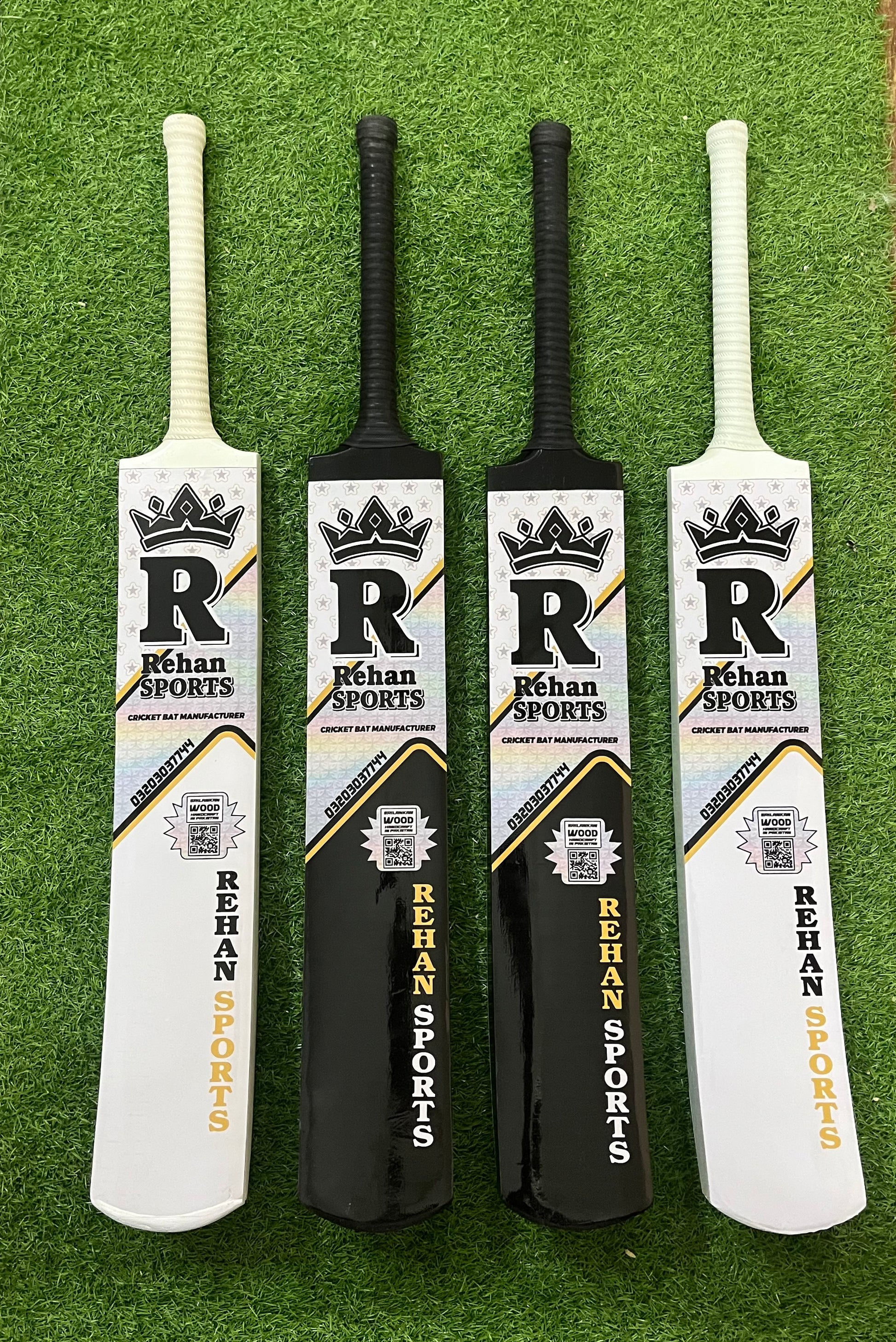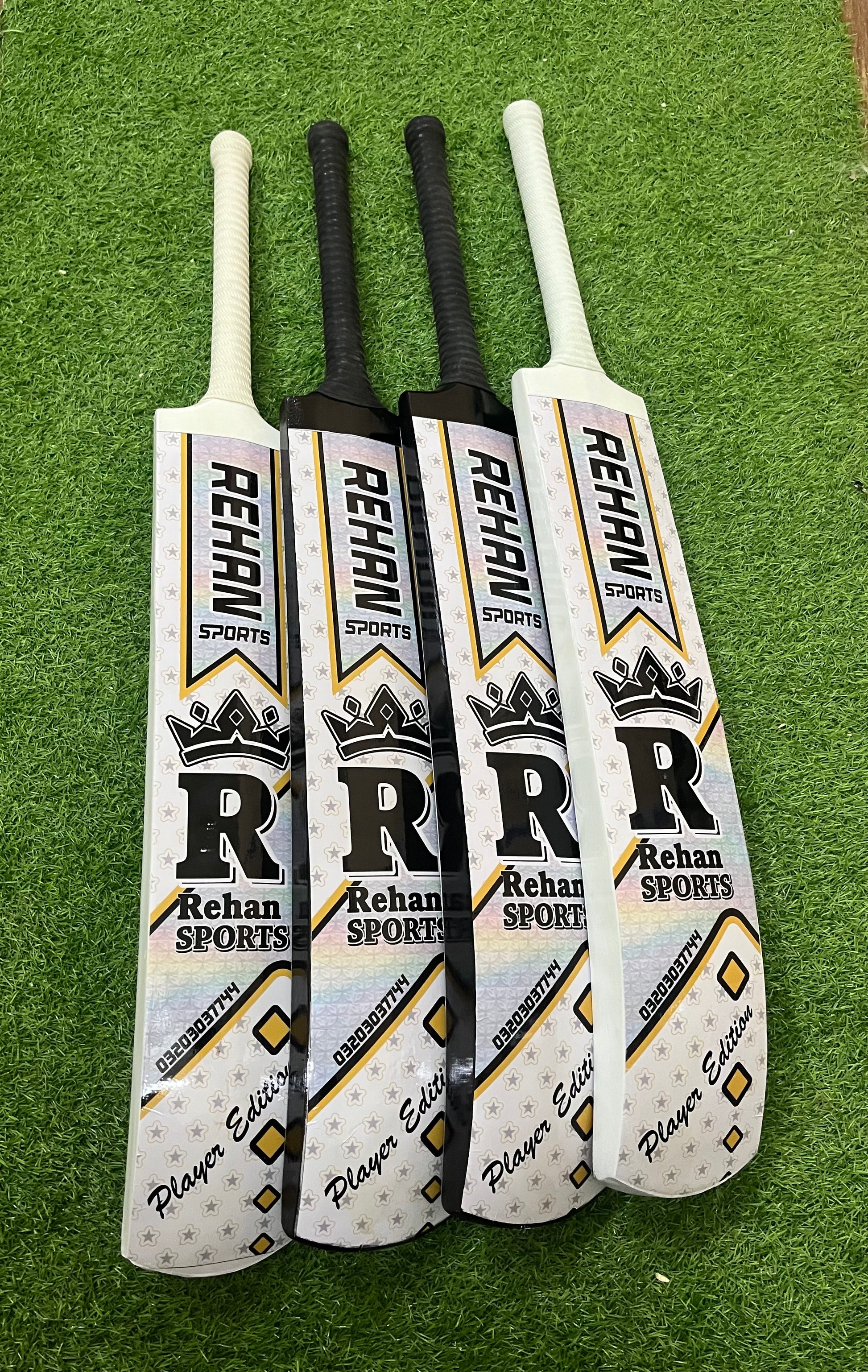 Rehan Sports Player Edition Tape Ball Bat is made from premium Indonesian imported 4-band wood, offering excellent durability and powerful performance. It features a full cane handle for better control and shock absorption, along with a 2.5-inch bottom for maximum hitting power.